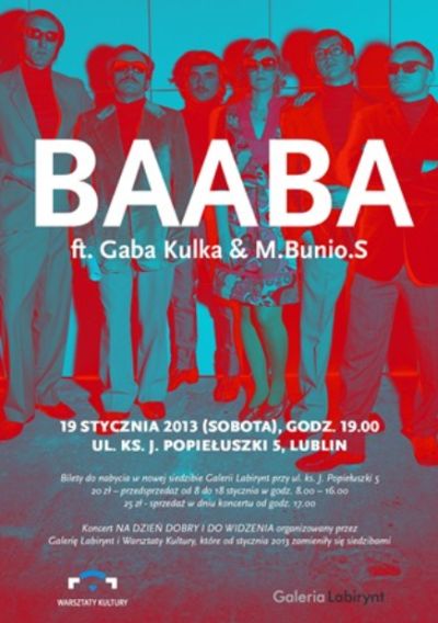 Koncert na dzień dobry i do widzenia przy ul. ks. J. Popiełuszki 5, 19 stycznia 2013 (sobota), godz. 19.00, bilety: 20 zł – przedsprzedaż od 8 do 18 stycznia w godz. 8.00 – 16.00; 25 zł - sprzedaż w dniu koncertu od godz. 17.00; bilety do nabycia w nowej siedzibie Galerii Labirynt przy ul. ks. J. Popiełuszki 5.