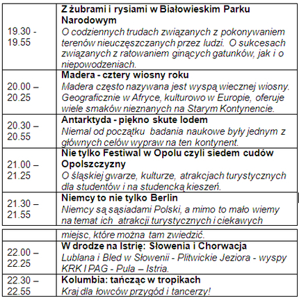 Szczegółowy program obejmuje slajdowiska ze świata (Kolumbia, Antarktyda, Portugalia, Niemcy, Słowenia, Chorwacja) oraz z Polski (Opolszczyzna i Białowieski Park Narodowy). Przewidziano stoiska związane z tematyką podróżniczą. Na wszystkie wydarzenia wstęp wolny.
