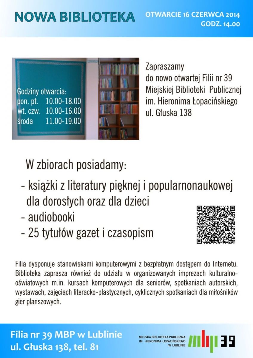 Filia nr 39 MBP zlokalizowana jest przy ulicy Głuskiej 138.