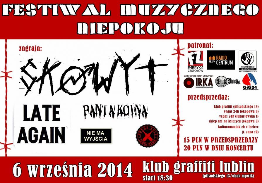 Skowyt, Panta Koina, Late Again, Nie Ma Wyjścia, Nocne Żule, 06.09.2014 godz. 18:30, Lublin (Lubelskie) - Club Graffiti, Al. Piłsudskiego 13.