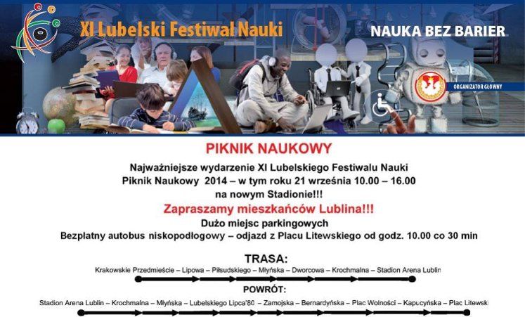 Przyjdź i zobacz, jak nowy stadion sprawdzi się jako lokalizacja naukowych pokazów i wystaw - za darmo! W najbliższą niedzielę specjalnymi bezpłatnymi autobusami MPK Lublin możecie dojechać z Centrum Lublina na Piknik Naukowy.