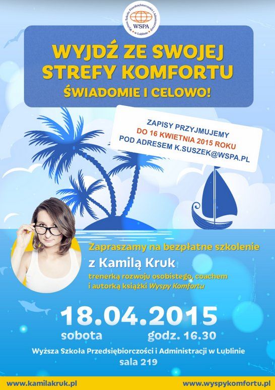 Więcej o szkoleniu oraz trenerce na stronie www.kamilakruk.pl oraz www.wyspykomfortu.pl