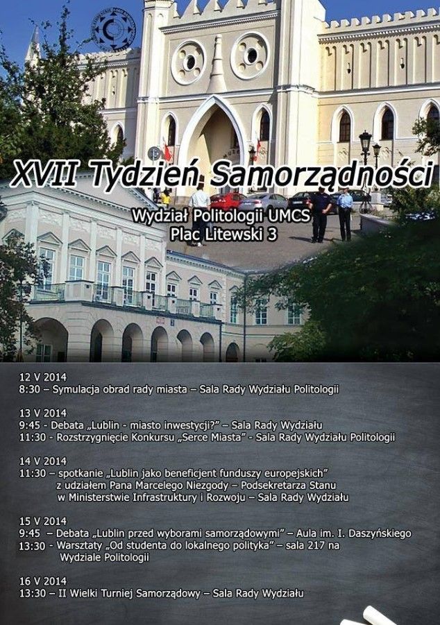 Tydzień Samorządności jest corocznym wydarzeniem organizowanym przez Naukowe Studenckie Koło Samorządowców UMCS. Ma na celu promowanie idei samorządności oraz poszerzanie wiedzy z zakresu samorządu terytorialnego wśród studentów oraz mieszkańców Lublina. W tym roku przypada 20. rocznica Tygodnia Samorządności, w związku z czym Koło przygotowało wiele przedsięwzięć naukowych. Wydarzenie odbędzie się w dn. 3–8 kwietnia 2017r.