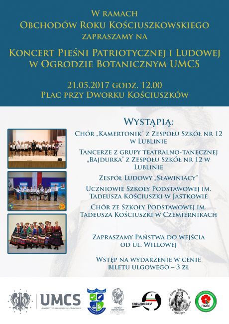 Koncert Pieśni Patriotycznej i Ludowej - w ramach obchodów Roku Kościuszkowskiego odbędzie się 21 maja. Wydarzenie rozpocznie się o godz. 12.00 na placu przy Dworku Kościuszków (na terenie Ogrodu Botanicznego).