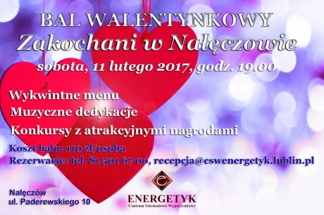 Bal odbędzie się 11 lutego 2017 r. od godz. 19:00 w Centrum Szkoleniowo-Wypoczynkowym Energetyk w Nałęczowie. W ofercie specjalne menu z nutką miłości, zabawa z DJ’em, muzyczne dedykacje, konkursy. Pozostały ostatnie wolne miejsca.