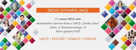 Drzwi Otwarte Uniwersytetu Marii Curie-Skłodowskiej odbędą się 11 marca 2016 roku w Akademickim Centrum Kultury Chatka Żaka przy ul. Idziego Radziszewskiego 16 w Lublinie. Start o godzinie 9:00.