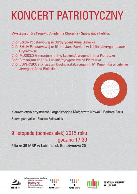 Miejska Biblioteka Publiczna w Lublinie zaprasza na KONCERT PATRIOTYCZNY 9 listopada (poniedziałek) 2015 roku godzina 17:30 Filia nr 35, ul. Bursztynowa 20