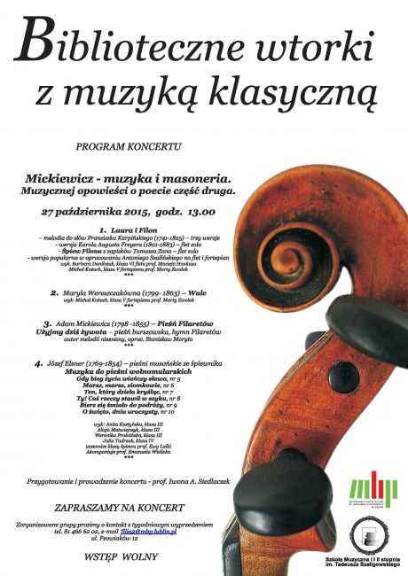 Miejska Biblioteka Publiczna zaprasza na kolejny koncert z cyklu "Biblioteczne wtorki z muzyką klasyczną" 27 października 2015, godz. 13.00 Mickiewicz - muzyka i masoneria. Muzycznej opowieści o poecie część druga, Filia nr 2, ul. Peowiaków 12