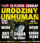 Już 12.listopada w poznańskim klubie Eskulap odbędzie się wielka impreza urodzinowa Sklepu Unhuman. Wystąpią: CHADA, WSRH, KOBRA&OLDAS, AIFAM, RAFI&KONI.